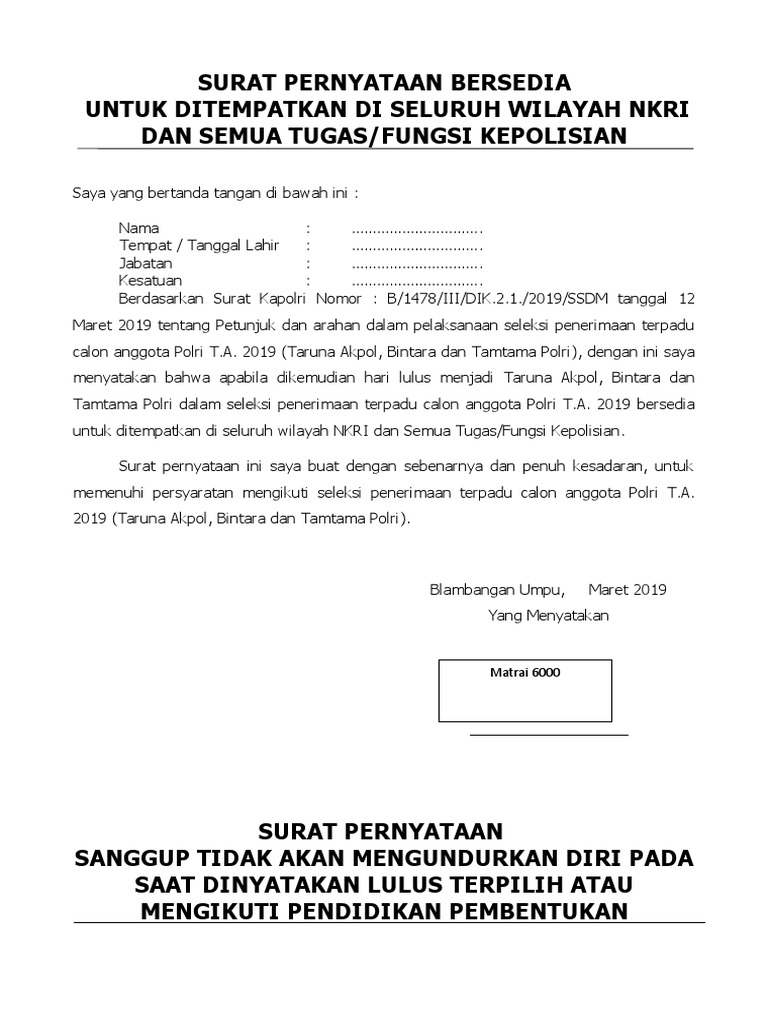 Contoh Surat Pernyataan Kerja Seperti Apa Ini Dia Dicontoh from 4.bp.blogspot.com Bersedia mengganti biaya yang telah dikeluarkan untuk proses seleksi yang bersangkutan apabila setelah dinyatakan lulus final yang bersangkutan mengundurkan diri secara sepihak. Dalam konteks wilayah kerja, surat bersedia ditempatkan di wilayah tempat mendaftar. Pernyataan tidak mengundurkan diri adalah pernyataan atas kesanggupan anda untuk tidak mundur dari proses. Demikian surat pernyataan ini saya buat dengan sebenarnya dan apabila dikemudian. Contoh surat bisnis, surat dinas, surat izin, surat kuasa, surat lamaran kerja, surat pemberitahuan, surat penawaran, surat pengunduran bersedia tidak mengambil cuti selama masa penugasan. Bersedia mengganti biaya jika mengundurkan diri sebagai cpns. Fungsinya adalah untuk melegalkan status tanggung jawab di perusahaan dan persyaratan administratif. Contoh surat pernyataan kerja siap ditempatkan dimana saja.